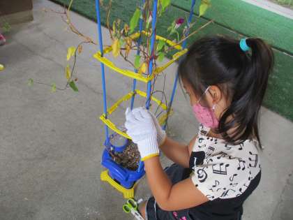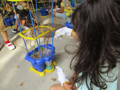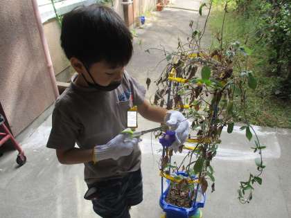 朝顔のツルを使って,リースを作りました。まずは,朝顔のツルだけになるよう,葉っぱや花をとっていきます。