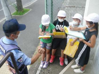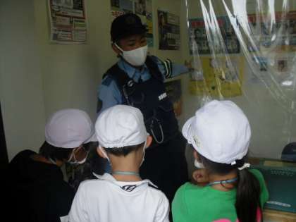 交番へインタビューへ行きました。警察官の方が持っておられる色々な道具も見せてもらったようです!