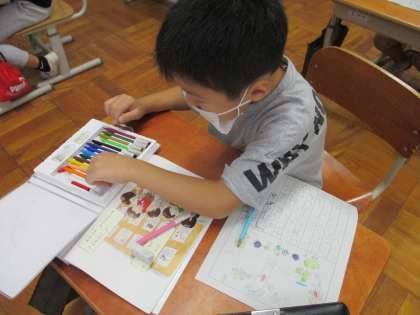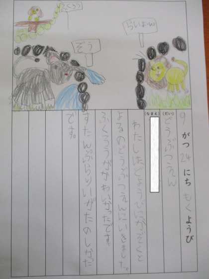 楽しかった出来事について,絵日記を書きました。絵日記には,「いつ」「だれと」「なにをした」ということに加え,そのときの自分の気持ちも書きました。