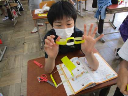 ふしぎな輪作りという学習で,同じ大きさの輪をつないで切ったり,輪の数を増やしたりしていろいろどんな形が出来るかを考えながら学習しました。