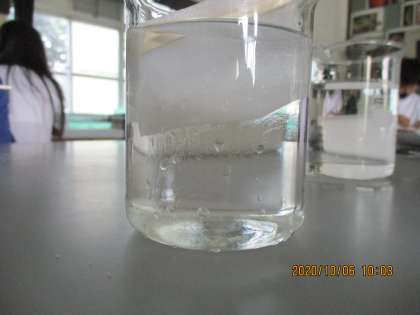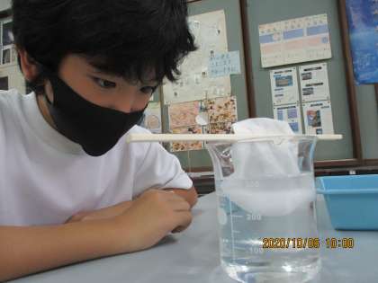 最初の導入として水を入れたビーカーと塩や砂糖を入れたティーパックを用意して,それぞれ上から吊るしてみました。
