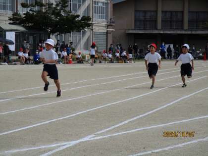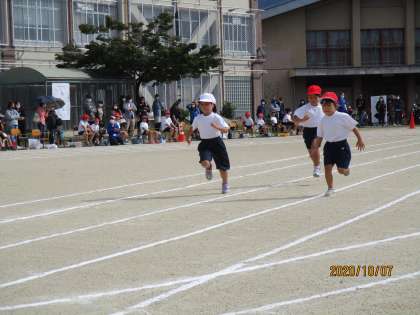 1年生,はじめての体育参観の1番はじめの競技は,50m走でした。しっかり腕を振りながら,最後まで走りきることができました。