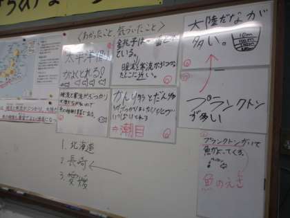 「日本はどうしてたくさんの魚が獲れるのか…」,その理由を資料から探し,発表しました。暖流・寒流などが関係していること,大陸だながよいえさ場になるなど,くわしく知ることができました。