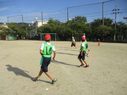 今日からタグラグビーの学習に入りました。今日はまだゲームはせずにパスや攻撃・守備の練習をしました。明日からゲームをします。