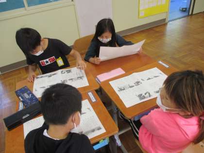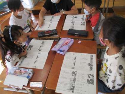 国語科では,「やくそく」の音読発表会にむけての練習をしています。「あおむし達が喧嘩をしているときは,大きな声で読もう。」「やくそくをしたときは,喧嘩をやめているから,優しい声で読もう。」などと,グループのみんなで話し合いながら練習をしました。