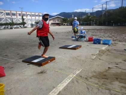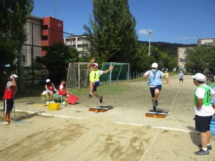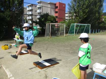 体育では走り幅跳びの学習をしています。自己ベストを目指して,たくさんの人が一生懸命練習をしています。準備・片づけ,係(合図,踏切を見る,記録を言う,記録を書く,砂ならし)にもしっかり責任をもって取り組むことができました。