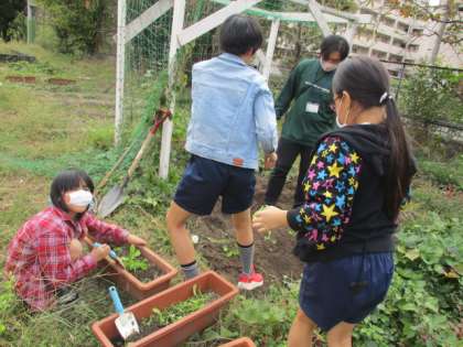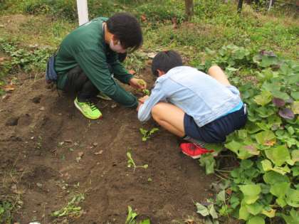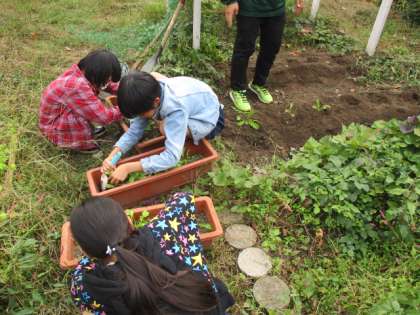 園芸係が育ててくれている大根が大きく育ってきたので,畑に植え替えをしました。