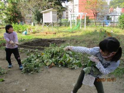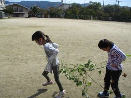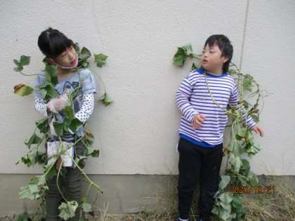 サツマイモを掘った後は,長いつるを使った遊びに挑戦!!