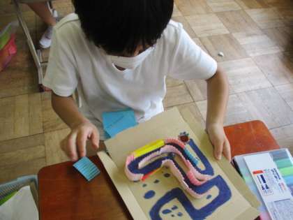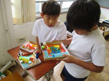 図工の時間に取り組んでいる「コロコロガーレ」ですが,最近は友達の作った作品を見合いながら,自然と交流する姿が見られます。