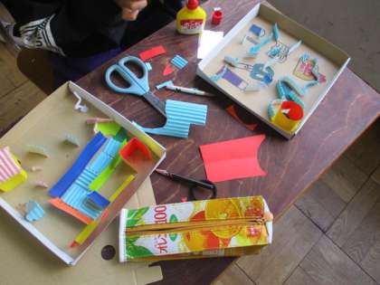 実際にビー玉を転がしてみて「これおもしろいな〜」「マネしてみよう」など,いいアイディアを自分の作品にも生かそうとしています。