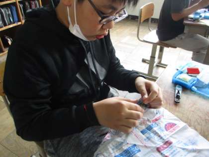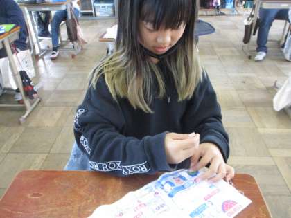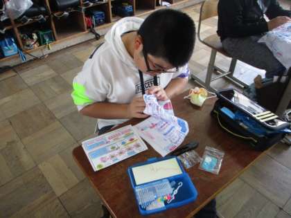 マスコット作りが終わり,今度はボタンをつける学習です。細かい作業ではありましたが,丁寧につけることができました。もし,自分の洋服やカバンのボタンが取れてしまったら,今日の学習を思い出して,自分でつけてみてほしいと思います。