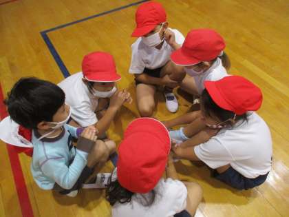 体育では,「じんとりゲーム」の学習をしています。今日は,赤と白のチームに分かれ,「ドン・じゃんけんほい」をやりました。作戦会議では,みんなで必死に勝つための工夫を考えていました。