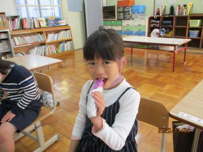 はじめに絵本「やきいもたいかい」の読み聞かせを聞き,画用紙で作ったさつまいもをアルミホイルで包んで,焼き芋の味を想像・・・。二人とも「美味しいポーズ」を取りながら食べる真似をしていました。