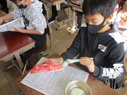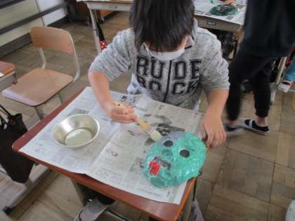 お面作りの仕上げでニスを塗りました。とてもいい感じに仕上がりました。