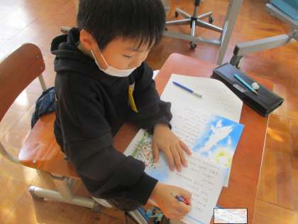 国語科の「くじらぐも」の学習で,お話をしている文を見つけて線を引きました。赤は,子ども達や先生,青はくじらぐもといったように,色分けをしながら,文をじっくり読むことができました。