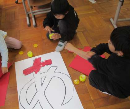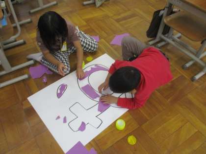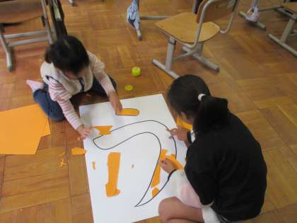おぐりすの子のつどいにむけて,劇の背景をみんなで作りました。「あいうえおげきじょう」なので,色紙でペタペタと貼りながら大きな「あいうえお」の文字を表しました。