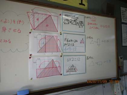 長方形の面積の公式や前回の直角三角形の求め方を参考に三角形の面積を求めました。いろいろな意見が出て,とてもおもしろかったです!自分の考えを図で表現したり,式に表したりできるようになってきている人が多いです。この調子で頑張りましょう!