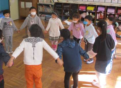 国語科で,くじらぐもにのる場面の様子を想像しながら,音読をしました。最後には,とみんなで手を繋いで輪になって「天までとどけ、一二三」と音読をしました。