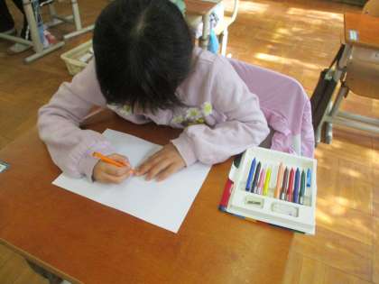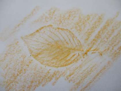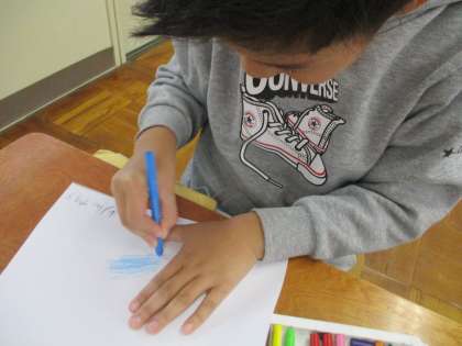 生活科で集めた落ち葉を紙の下にしいて,クーピーでこすっていくと,あら不思議!!葉っぱの模様が浮かび上がりました。子どもたちは,夢中になっていました。