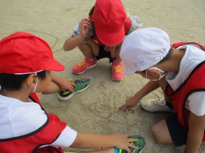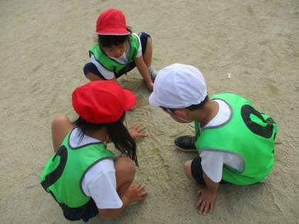 ルールにもだいぶ慣れてきて,作戦会議にも力が入ってきました。こちらが何も言わなくても,自分たちで砂に図をかいて,「こうやって動こう!!」と話していて,友達に分かりやすく説明しようとしている姿がとても素敵でした。