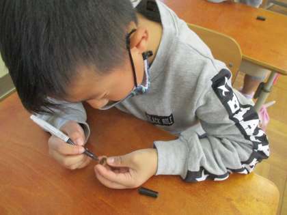 生活科で,集めたどんぐりを使って,どんぐりごまを作りました。まずは,どんぐりに,すきな模様を描きました。