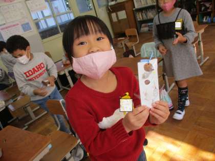 以前,作った「秋のしおり」も完成しました。どんぐりごまと一緒に持ち帰っています。