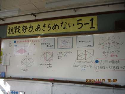 昨日の台形に引き続き,今日は「ひし形」の面積を求めました。今回もいろいろな意見が出ました!これまで学んだことを生かして,いろいろな形の面積を求めることができ,子どもたちもとても楽しそうです。