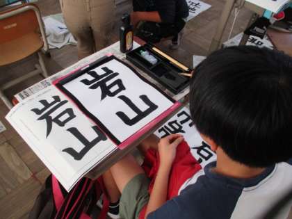 「岩山」コースは,「山」という字が,上に来たときは縦の幅が狭くなり,縦画も短くなる事に気をつけながら書きました。