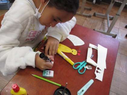 今日は,風の力で走るための帆を作りはじめたり,タイヤの模様を工夫したりする子が出てきて,だんだんと個性のある車になってきています。