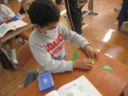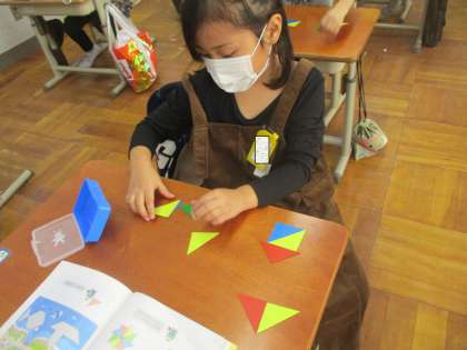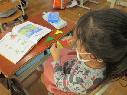 算数では,「かたちづくり」の学習に入りました。今日は,見本通りの形をつくることに挑戦しました。