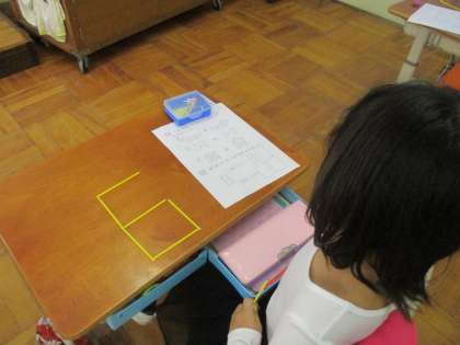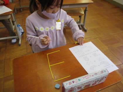 今日は,三角で作った形から,さらに1枚だけ動かして違う形にしたり,棒でつくった形から,さらに1本だけとって違う形にしたりしました。