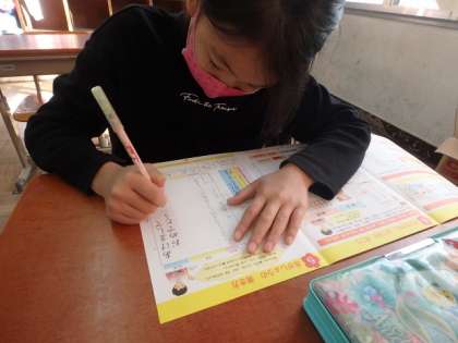 年賀状の書き方について学習しました。「年賀状って何?」「干支の順番ってどうやって決まったの?」という話をすると,子どもたちは興味深々で話を聞いていました。