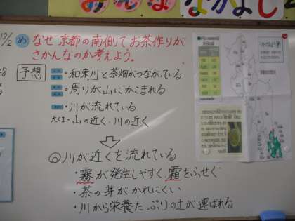 社会科では,どうして京都府の南部でお茶作りが盛んなのかを,地図帳を見て予想をしながら考えていきました。
