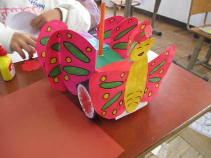 ドリームカーも完成に近づき,子ども達はゴムや風の力を使って実際に走らせながら,もっとよく走るように工夫を考え始めました。