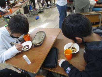 子ども達はしっかりはしをもち,細かい豆を上手につかむことが出来ていました。