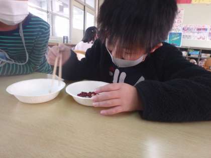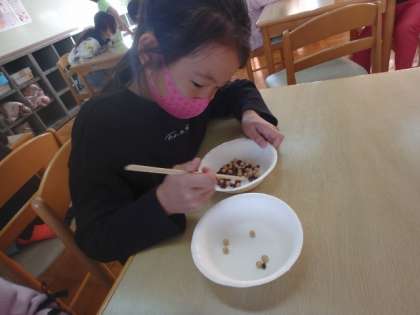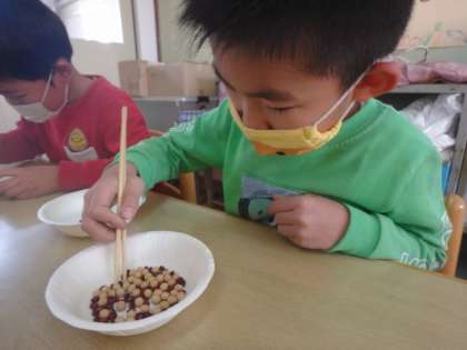 豆つかみに挑戦しました!小さな小豆を上手につかむことができていてびっくりしました!この機会に,正しいお箸の持ち方について学んでくれればと思います。