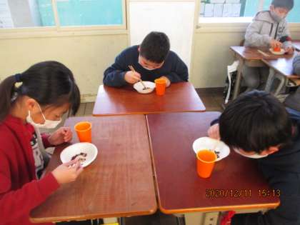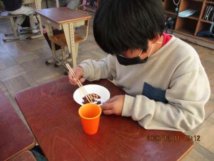 給食週間の取り組みで豆つまみをしました。正しいお箸の持ち方に苦戦をしている人もいましたが,みんな楽しんで取り組むことができました。