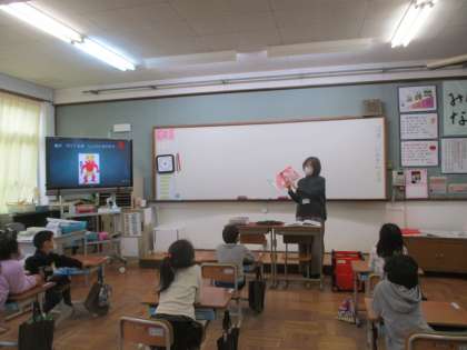 図書館司書の永井先生にブックトークをしてもらいました。今回のテーマは,「鬼」です。鬼に関するたくさんの本を紹介してもらったあと,読み聞かせをしてもらいました。