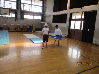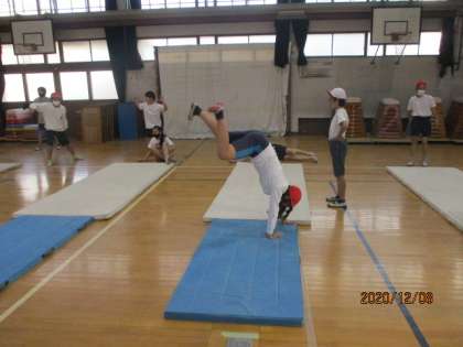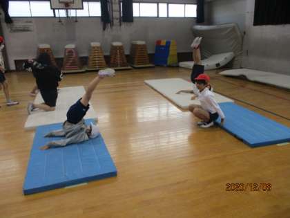 体ならしの運動では今年度から背支持倒立に取り組んでいます。積極的に取り組むことができています。