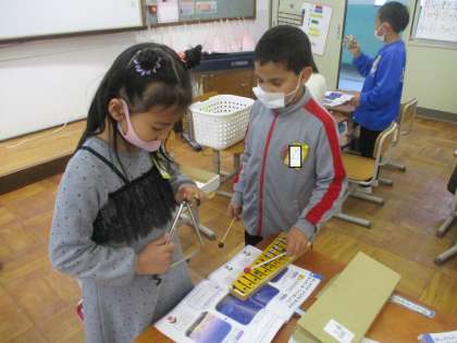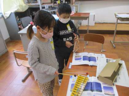 音楽では,ペアで協力をしての音楽作りに取り組んでいます。1.夕方星が少しずつ光り出す。2.夜たくさんの星が光る。3.明け方星が消えていく。という3つの場面を想像して,どの楽器でその様子を表そうか。どのリズムでしようか。などと,話し合いをしながら作っています。