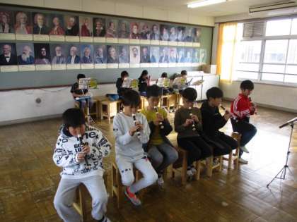 音楽では「茶色の小びん」の合奏を音楽室でおこないました。