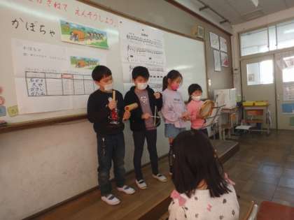 グループの中で演奏する順番や楽器を変え,「かぼちゃ」の曲を演奏しました。2回目となったこの日には,曲を口ずさめる子も多くなっていました。授業の最後には,グループごとに発表会!みんな本当に上手でした!