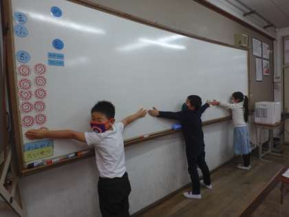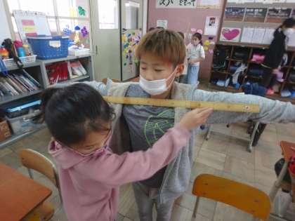 算数の学習で「自分が腕を広げた時の長さ」を調べました。自分たちが持っている30cmものさしでは,長さが測りづらいことに気が付いた子どもたち。この日は100cmものさしを使って長さを測りました。グループで協力しながら活動する姿がすてきでした。