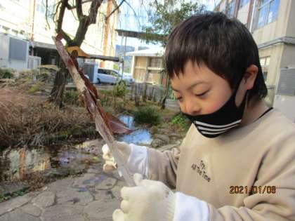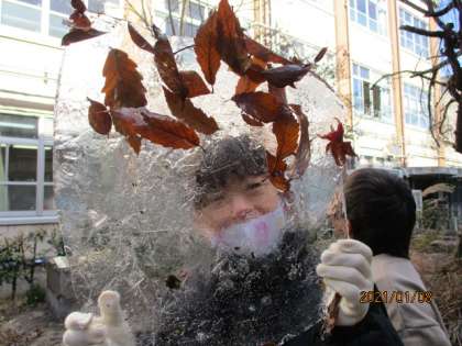 池に浮かんでいた葉っぱや木の枝も一緒に凍っていて,自然の作った芸術作品のような氷にしばし見入っていました。