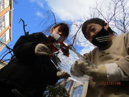 持ち上げてみると,思った以上に厚くて重くて冷たく,二人とも驚いた様子でした。
