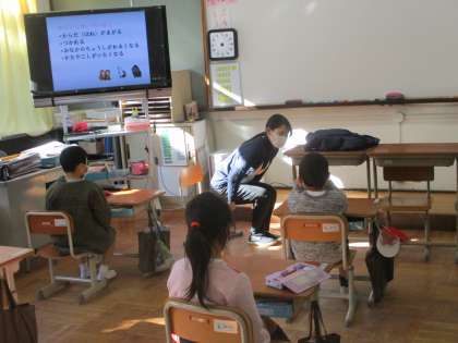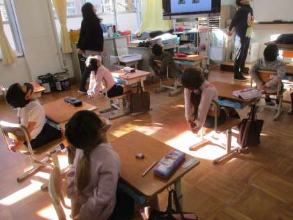養護教諭の片山先生から姿勢のお話を聞きました。正しい姿勢をしていないと,背骨が曲がったり,お腹の調子を悪くしたりするということを聞き,子ども達は驚いていました。最後には,姿勢をリセットするキャットレッチを行い,スッキリいい姿勢になっていました。