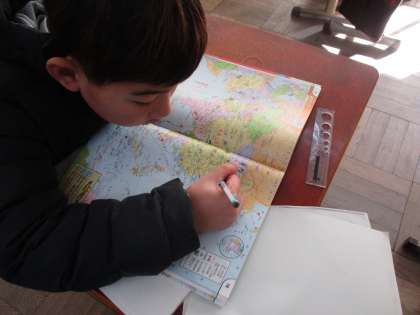 京都府の中ですが,ほとんど行ったことのない地域という事もあり,まずは京都のどこにあるのかを確認し,その後,交流をしている他の国の位置を地図帳を使って調べました。