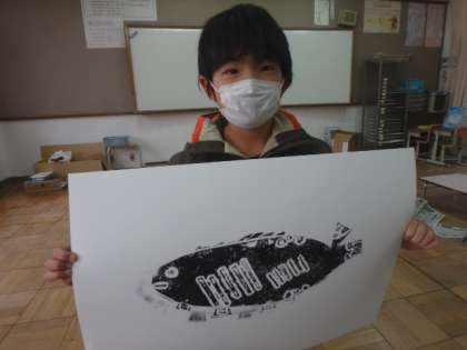 作った魚の紙版で刷ってみました!子どもたちは「お〜!」と言いながら,自分の作品を味わっていました。インクを付ける量の加減や,端までしっかりと形を表すのが難しかったようです。