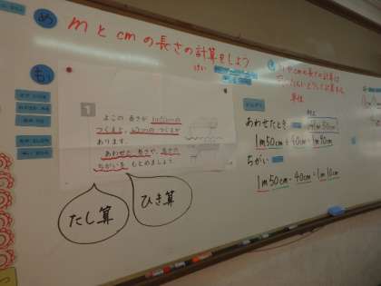 「m」や「cm」の長さの計算の仕方について学習しました。「cm」や「mm」の時と同じように,同じ単位ごとに計算をするということに気付くことができました。