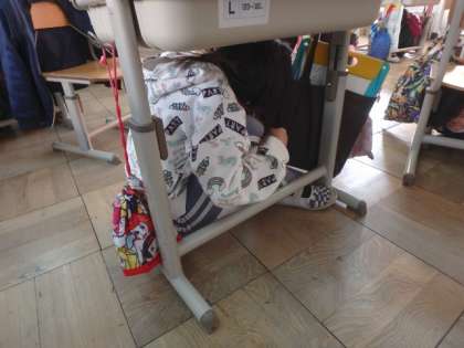 学級活動の時間に安全についての学習をしました。今回は,地震が起きた時の対処方法や,地震に備えて,普段から自分たちにできることを考えました。学習の中で「消火器」の話になった時,子どもたちが「消火器ってどうやって使うの?」という疑問が出たため,急きょ,消火器の使い方を学習しました。子どもたちは興味津々で話を聞いていました。